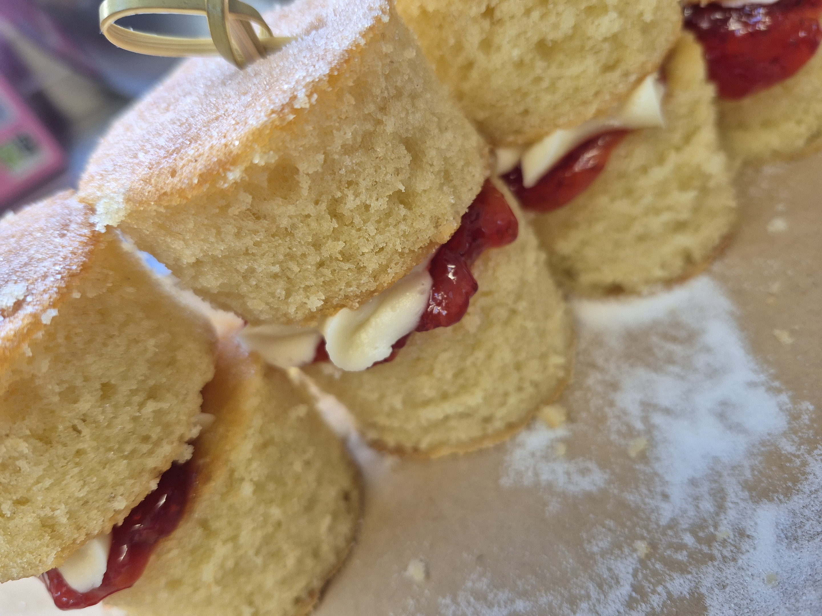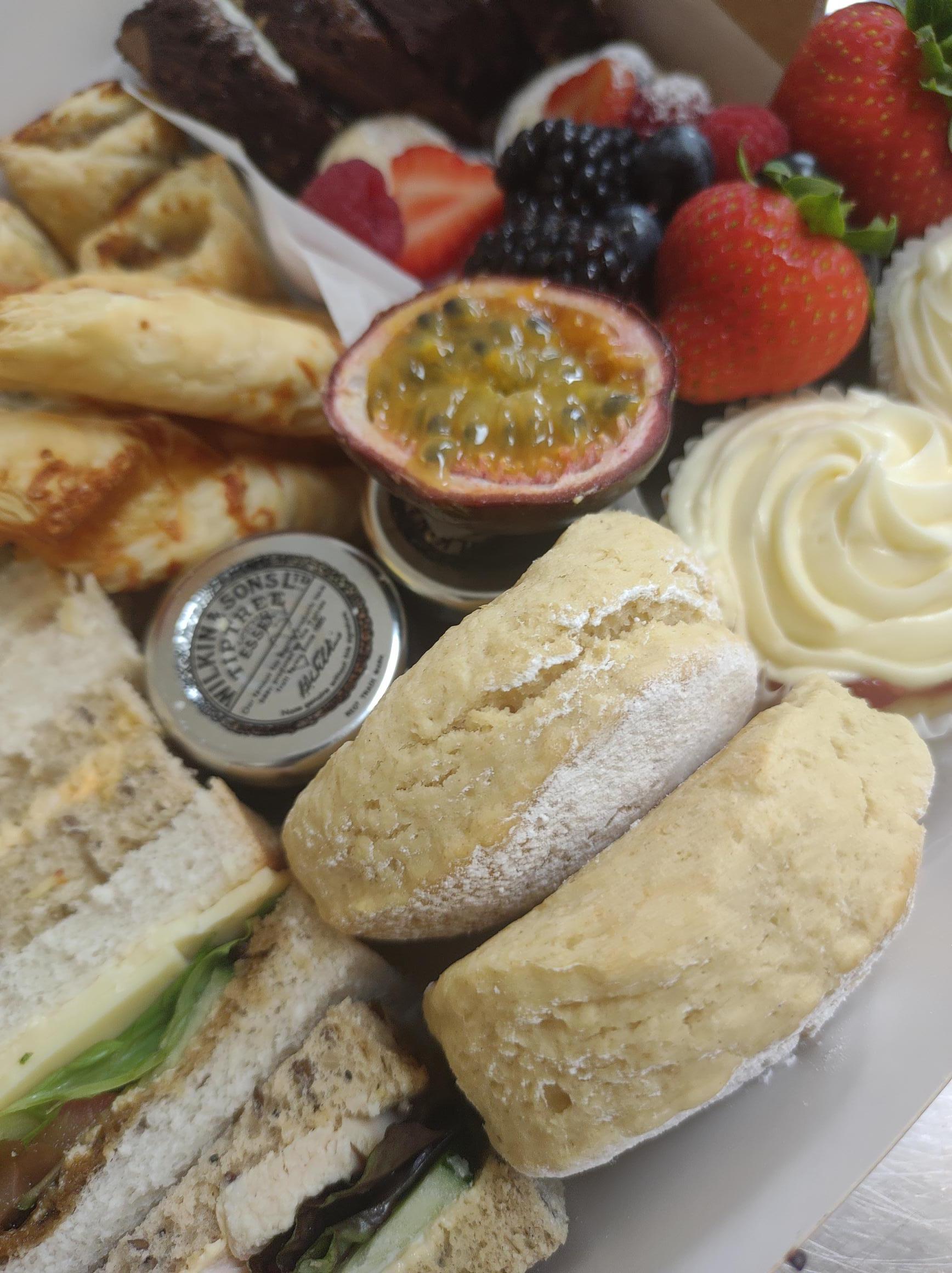 Mixed finger sandwiches, quiche Lorraine, cheese straws, small scones with clotted cream and jam, triple chocolate brownie, lemon drizzle slice, mini Victoria sandwich and fresh fruit